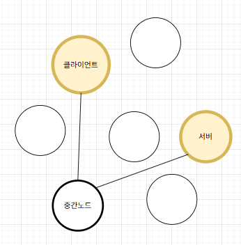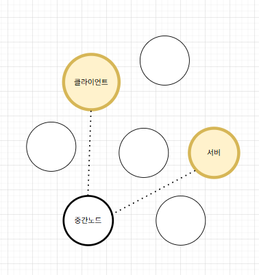 이때까지는 그림을 그린다면 클라이언트가 서버와 통신을 할 때, 서버와 직접 연결되어있지 않기 때문에 메시지를 전달하는 과정의 중간 노드들이 있고, 노드들간의 연결은 선으로 이어져있는 느낌이었다면,